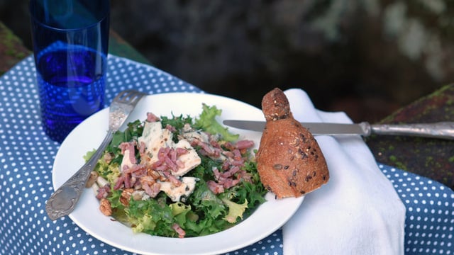 Servez avec une salade frisée garnie avec des raisin et pommes du jardin.