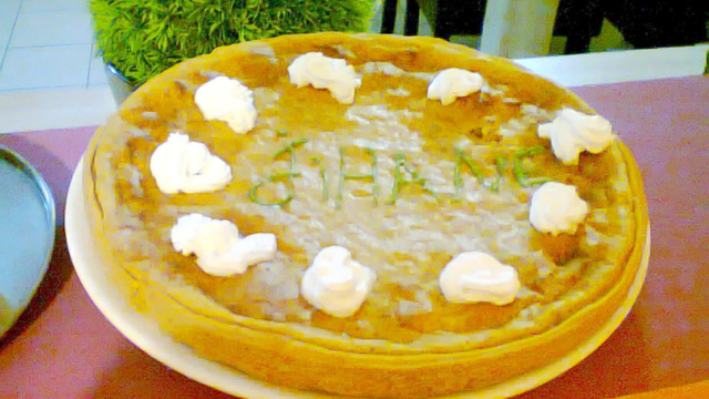 Dans Une autre bol les blancs d'oeufs et ajouter le fromage blanc et mélanger les ingrédients avec une spatule. Verser dans le moule et lissez la surface du gâteau.