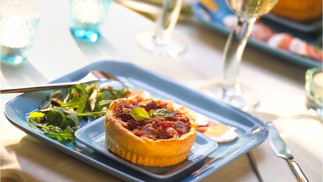 Mettre au four 20 min Sortir du four et disposer quelques feuilles de roquette sur le dessus. A déguster chaud ou froid.