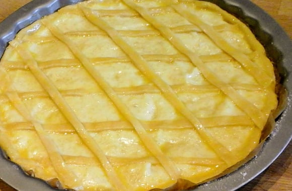 Préchauffez le four à 180°C. Farinez légèrement le plan de travail, étalez la pâte à l'aide d'un rouleau à pâtisserie. Tapissez le moule à tarte de papier cuisson, déposez la pâte, retirez le surplus et gardez bien les restes de pâte. Repliez la pâte vers l'intérieur afin de réaliser le "gros bord". Ajoutez la crème et saupoudrez de cassonade. Étalez le reste de la pâte, découpez de fines lanières et déposez-les sur la crème. Fouettez un jaune d’œuf et dorez la pâte. Placez au four pendant 25 minutes. Laissez refroidir avant de déguster.
