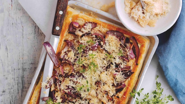 Disposer les oignons rouges sur la pâte à l'intérieur de la bordure. Disposer ensuite le Parmigiano Reggiano par-dessus les oignons et saupoudrer le tout de thym. Badigeonner à nouveau d'œuf le bord de la pâte. Remettre au four pendant environ dix minutes jusqu'à ce que le dessus de la garniture soit légèrement doré.