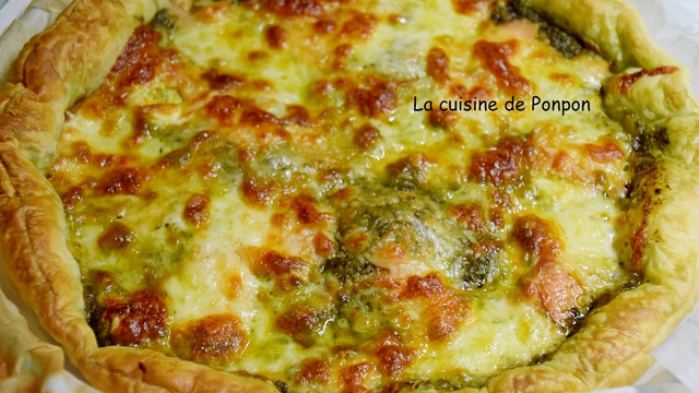 1Étaler la pâte feuilletée sur son papier sulfurisé dans un moule à tarte. Répartir le pesto sur toute la surface. Disposer les tranches de l'oeuf cuit dur.