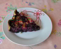Mélanger la crème, le sucre, la farine et les œoeufs, ajouter les baies de sureau et verser le tout sur la pâte. Verser dessus les pommes.