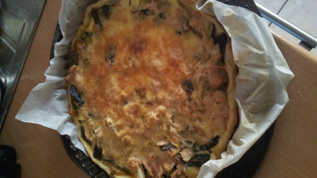 Quand les poireaux sont bien cuits. Arrêter le feu et ajouter le thon, les oeufs, la crème et le gruyère.