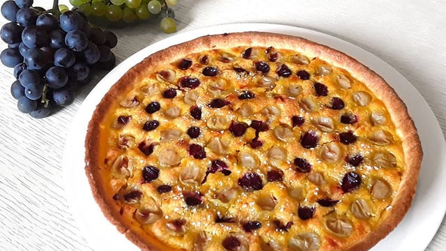 Étaler la pâte entre deux feuilles de papier cuisson, enlever la première feuille, l'installer dans le moule à tarte de diamètre 22/24 cm piquer le fond à la fourchette, égaliser les bords et mettre au frais. Épépiner les raisins en faisant une petite entaille avec un couteau de cuisine les pépins sortiront facilement. Préchauffer le four à 180°C chaleur tournante. Répartir la crème sur la pâte et recouvrir de raisins épépinés. Mettre au four 30 mn surveiller la cuisson en fonction de votre four. Laisser totalement refroidir avant de démouler. Servir frais avec un nuage de sucre glace sur votre gâteau (facultatif).