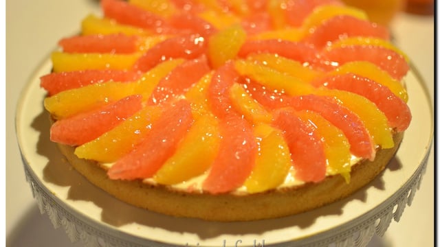 Tarte pleine de couleur, acidulée composé d'une pâte sablé, une crème d'amande, une crème diplomate au Yuzu et enfin des suprême d'orange et de pamplemousse .