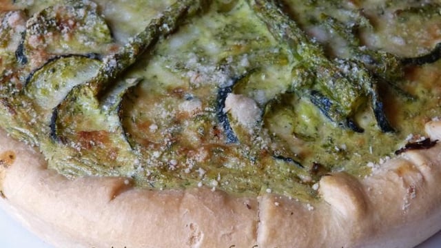 Une pâte à pizza façon tarte avec de délicieux légumes de saison et une délicieuse crème à base de roquette et de chèvre. Succulent.