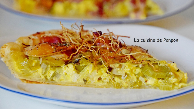 Voici une tarte bien sympathique avec le fondant et le croquant du poireau : le fondant du blanc de poireau précuit à la poêle et le croquant de la racine du poireau rissolée dans la friture!