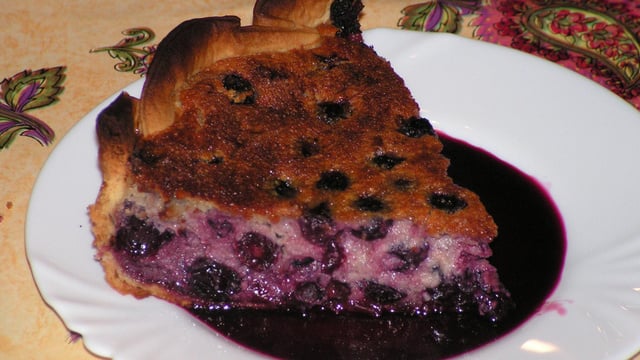 Tapisser un moule à bord haut, beurré et farine de pâte sablée (ou conserver le papier sulfurisé en dessous). Recouvrir le fond de cerises égouttées. Napper avec le mélange aux œufs et mettre au four 30 mn. Servir tiède ou froid avec le jus des cerises.