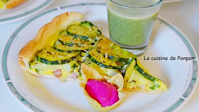 La saison des courgettes bat son plein et même si ce n'est plus la saison des orties, j'ai toujours des petites barquettes de soupe au congélateur. Une soupe aux orties que bien souvent mes hôtes découvrent. Étant donné que je devais couper ma tarte en 10 parts, celles-ci étaient un peu petites dans l'assiette, j'ai donc ajouté une soupe et un petit amuse bouche !