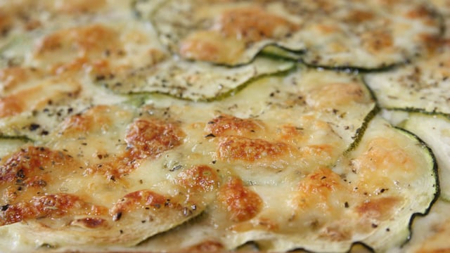 Une tarte aux fines rondelles de courgettes recouvertes de petits morceaux de comté, de mozzarella et d'herbes de Provence.