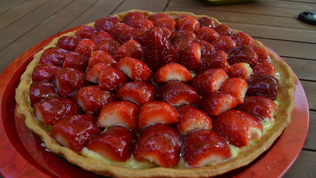 Sur le fond de tarte cuit, étaler la crème pâtissière. Disposer les fraises en corole.