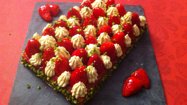 Une tarte aux fraises sur une pâte shortbread nappé d'un lit de crème d'amande et de confiture de fraises, puis de crème montée à la pistache.