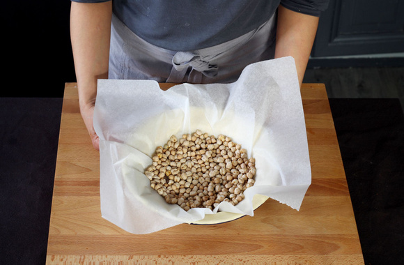 5Déposez dessus une feuille de papier sulfurisé et quelques pois chiches secs et enfournez dans un four préchauffé à 180°C pendant une petite vingtaine de minutes.