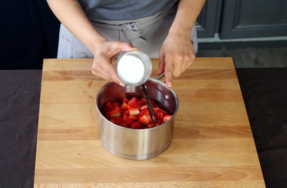 2Mettez les fraises dans une casserole avec le sucre et 2 cuillères à soupe d'eau. Ajoutez la gousse de vanille fendue dans la longueur.