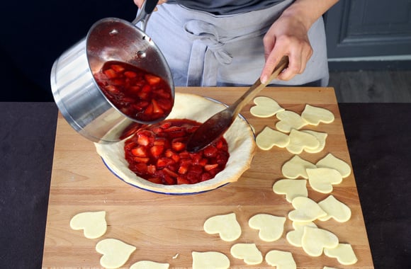 8Déposez les cœurs de pâte sablée artistiquement afin de couvrir la compotée de fraise. Commencez par le bord extérieur de la tarte.