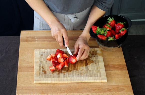 1Lavez les fraises, équeutez-les, coupez-les en deux.