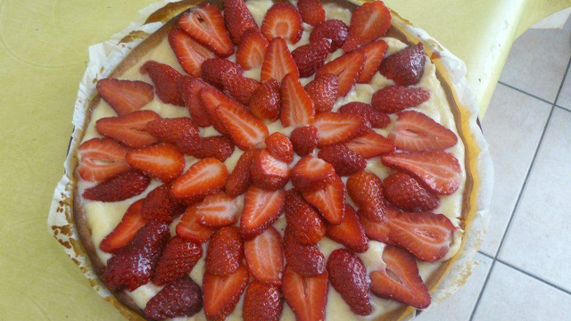 Une fois la crème refroidie, l'étaler sur la pâte. Placer les fraises. Réaliser un nappage neutre et badigeonner les fraises pour qu'elles soient brillantes.