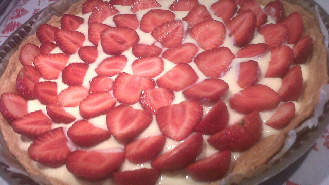 Verser la crème dans le fond de tarte brisée et disposer avec du style les fraises coupées en deux.