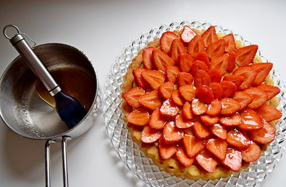 4Déco : laver, équeuter et couper les fraises en deux. Placer les demi fraises en commençant pas les plus grosses, sur le bord extérieur, côté intérieur vers le haut, bien visible. Continuer jusqu'au centre.