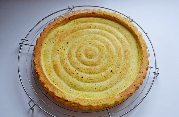 1Pâte : dans un saladier, blanchir les oeufs avec le sucre fin. Ajouter le beurre mou et mélanger. Ajouter la farine, la poudre de combava, la levure et mélanger. Verser la pâte sur le moule spécial tarte à garnir, ayant une rigole sur le tour.