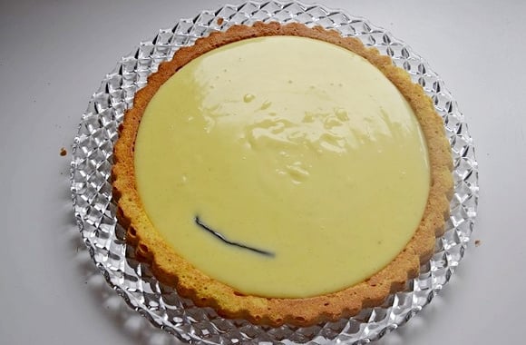 3Crème jaune vanille :dans un poêlon, faire chauffer le lait avec la demi gousse de vanille et le sucre fin. Prélever un peu de lait pour diluer la crème à flan dans un ramequin. Verser ce mélange dans le lait et mélanger jusqu'à ébullition. Débarrasser sur la pâte à tarte et retirer la demi gousse de vanille.