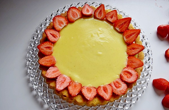 Une tarte aux fraises avec une pâte dans mon moule inversé, une crème vanille et des fraises par dessus. C'est pour moi, la recette la plus facile car la pâte sucrée j'adore mais c'est plus compliqué à réaliser et j'aime la facilité... Il faut seulement avoir le bon moule.