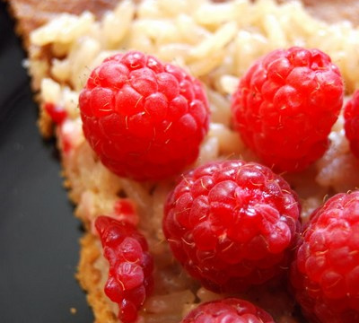 Une recette qui sort de l'ordinaire avec du riz au lait et des framboises sur un lit de pâte sablée