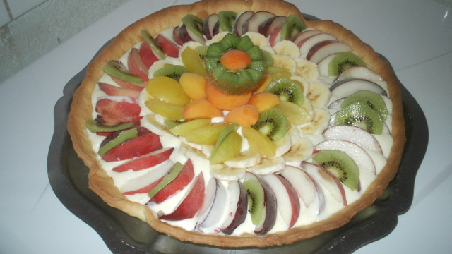 Procédez au montage. Garnissez de crème le fond de tarte et finissez avec les fruits choisis, coupés en lamelles ou en rondelles (selon les fruits).