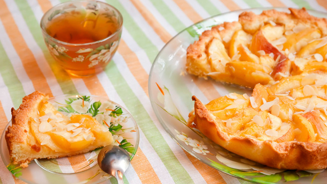 Verser le mélange oeufs sur les pêches. Ajouter des amandes effilées pour le décor.