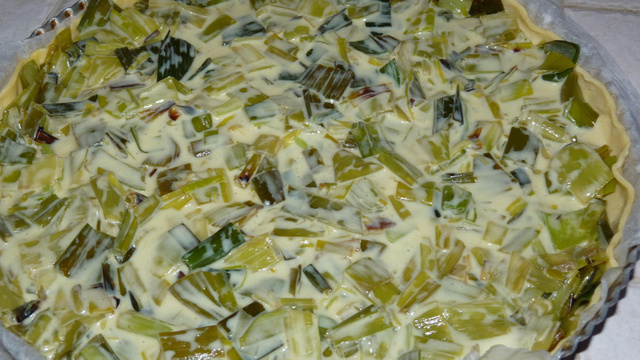 Prendre les poireaux, dérouler la pâte feuilletée dans un moule à tarte et y déposer les poireaux. Recouvrir le tout de l'appareil, oeufs, crème et curry.