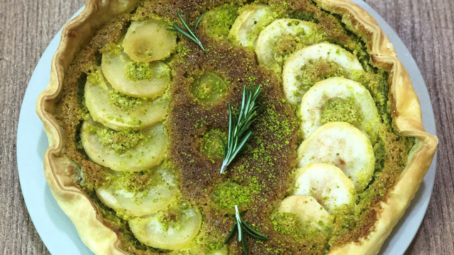 Une tarte délicieuse avec un chouette mariage poire/romarin/pistache.