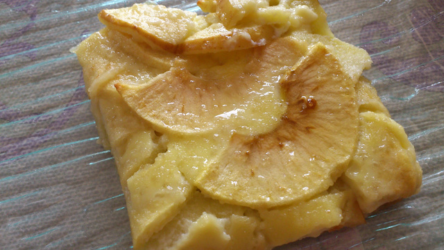 Dérouller votre pâte feuilletée, mettre les lamelles de pomme sur votre pâte puis le mélange du saladier.
