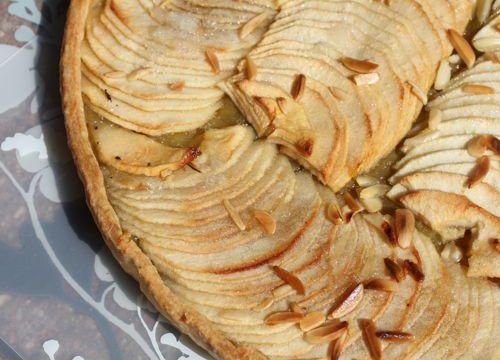 Une tarte où les pommes sont cuites sur un lit de compote de rhubarbe, deux saveurs acidulées complémentaires.