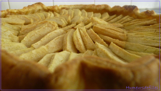 Verser sur la pâte feuilletée. Eplucher les pommes et les disposer sur la crème pâtissière.