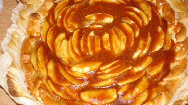 Une délicieuse tarte aux pommes, très simple avec un nappage caramel beurre salé.