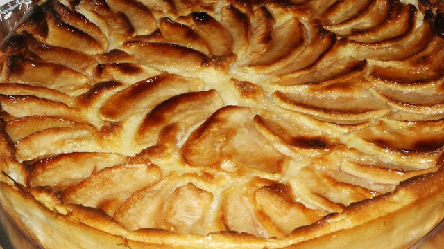 Versez la crème sur le fond de pâte piquée et disposez dessus les tranches de pommes en rosace.