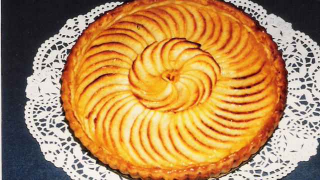 Une simple tarte aux pommes, cuite en profondeur, dont la coupe uniforme des pommes et leur disposition en fait l'originalité.