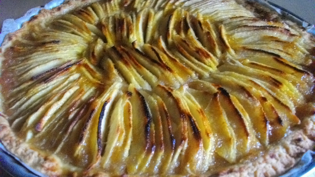 Préchauffez le four à 200°C pendant 20 minutes et enfournez la tarte pour 40 minutes à 200°C puis entre 3 et 5 minutes sous le grill du four pour obtenir l'effet gelée et que les pommes caramélisent. On surveille bien pour ne pas avoir l'effet brûlé, ça peut arriver très vite!