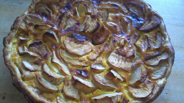 Épluchez les pommes, les coupez et faire un lit de pomme sur la pâte.