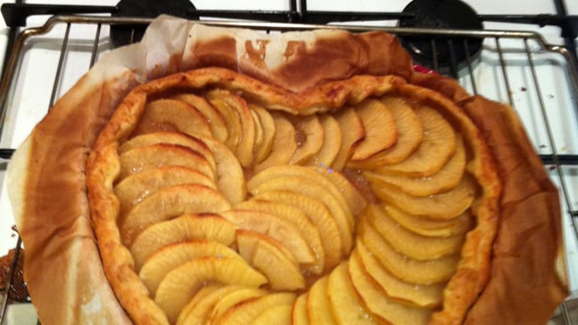 Faire chauffer le four à 200°C. Pendant ce temps, découper en rondelles les 3 autres pommes. Faire cuire 4 minutes la pâte seule au four.
