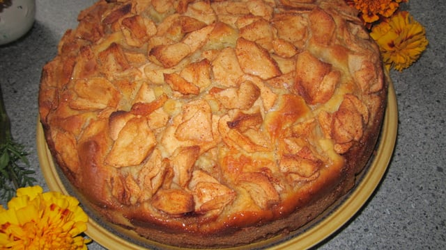 - 2Beurrer un moule et y étaler la moitié de la pâte.Verser dessus la moitié des fruits, puis recouvrez-les de la deuxième moitié de pâte et finisser par le reste de fruits.