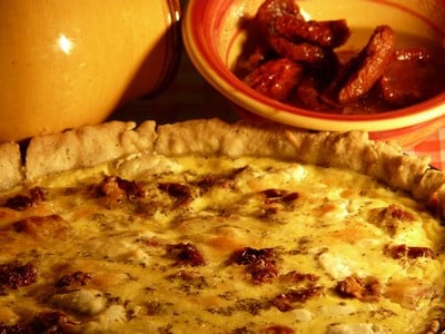 Une tarte pleine de couleurs et de saveurs! Les tomates confites se marient merveilleusement avec le chèvre fondant, le jambon cru leur répond bien et la pâte au romarin sublime le tout !