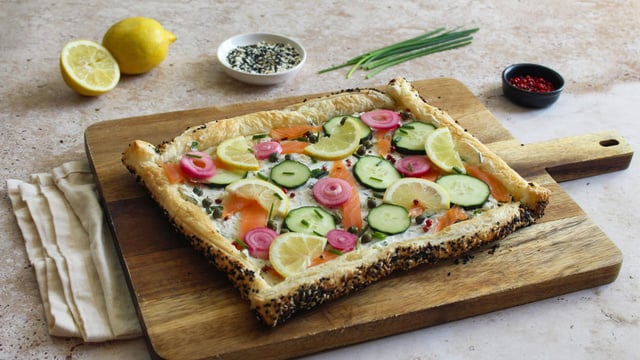 Cette tarte s’inspire du bagel dans une version rafraîchissante. Avec du saumon, des concombres, du citron et des pickles d’oignons, c’est un délice pour les papilles.