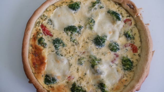 Répartissez les brocolis et les tomates sur le fond de tarte et recouvrez-les de crème.