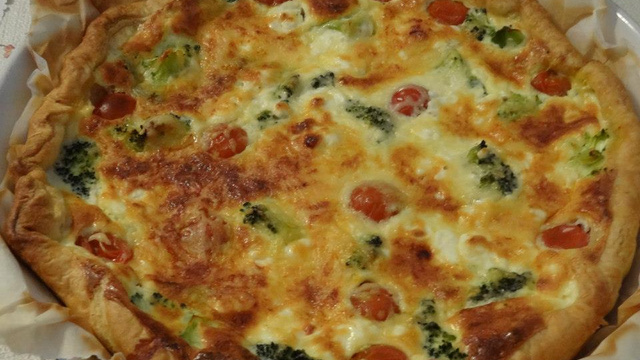 Cuire le brocoli a la vapeur. Dans une assiette émietter grossièrement le fromage de chèvre. Dans un saladier, battre les œufs en omelette, ajouter la crème, puis le formage de chèvre. Saler, poivrer. Dans un moule a tarte, dérouler la pâte feuilletée. Étaler le brocoli, les tomates cerise. Recouvrir du mélange avec les œufs, puis du gruyère râpé. Cuire a four chaud a 180 ° pendant 30/40 min.