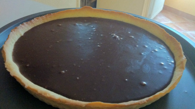 Ajouter le chocolat au lait au mélange et faire fondre hors du feu. Une fois que la préparation est devenu homogène, verser le contenu sur la pâte brisée déjà cuite.