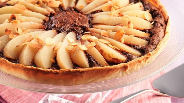 Peler, épépiner et couper les poires en grosses lamelles. Faire dorer les amandes effilées dans une poêle chaude, sans matière grasse. Verser la préparation au chocolat sur le fond de pâte pré-cuit, disposer les lamelles de poires. Enfourner pour 20 min. Décorer d'amandes effilées.