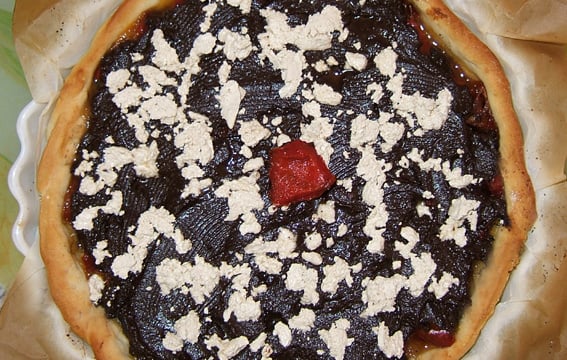 Tarte composée de poivrons recouvert d'une ganache au chocolat aux parfums d'amandes.