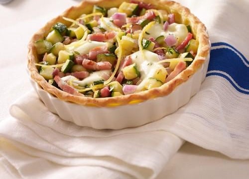 Répartissez cette poêlée sur le fond de votre tarte, placez la mozzarella en rosace et faites cuire dans le bas de votre four 25 à 30 min.